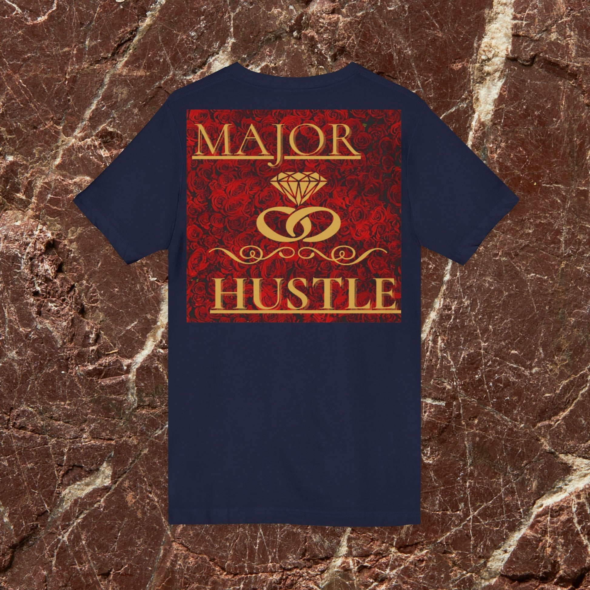 This V-neck tee carries a bold, urban energy — visuals that read like a personal manifesto. The front artwork, titled “VISION,” layers geometric red pyramids, a distant sun, and metallic accents over a dark backdrop; it feels like a late-night city dream, ambitious and deliberate. The back shows a textured red panel with gold lettering and emblematic symbols that read “MAJOR HUSTLE,” turning the shirt into a quiet statement of drive and refinement. Lightweight cotton keeps the feel breathable and easy to layer. Wear it when you want your outfit to reflect late-night planning sessions, studio grind, or that quiet confidence before a big move. The look pairs with worn denim, a leather jacket, or clean sneakers — it’s for people who build momentum and celebrate craft, not flash.